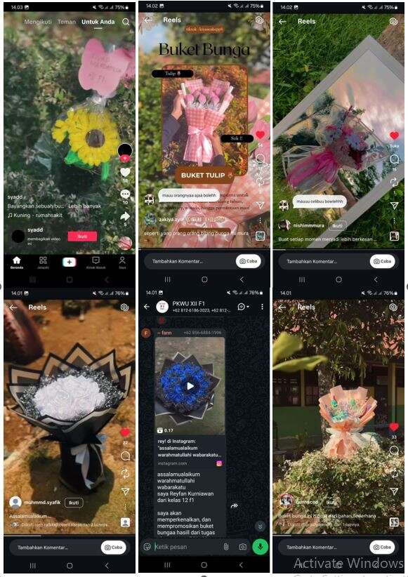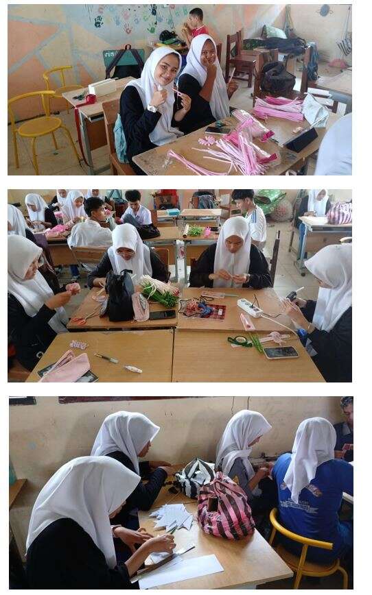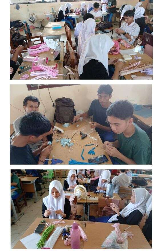 b. Inti (70 menit) Eksplorasi (15 menit): Siswa dibagi menjadi kelompok (4-5 orang) untuk mengamati contoh bunga buket dan vas dari bahan daur ulang, dikelola melalui PBM: Siswa identifikasi masalah desain (misalnya, "Buket ini kurang marketable karena..."), guru fasilitasi. Siswa mencatat prinsip desain (keseimbangan, warna) menggunakan lembar observasi, dengan referensi dari stakeholder (foto kreasi UMKM). Aplikasi (15 menit): Setiap kelompok mempraktikkan teknik kreasi (pemotongan kertas krep, pembentukan kawat, wrapping pita), dengan bimbingan guru dan tips singkat dari rekaman stakeholder. Guru memandu |